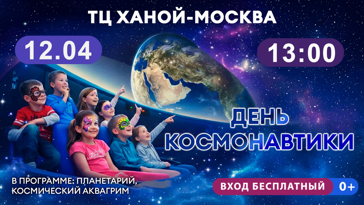 12 апреля «Ханой-Москва» взлетает в космос! Друзья, готовьтесь к невероятному приключению в честь Дня космонавтики! Маленькие звездочеты — на 2-м этаже зажигается настоящий планетарий! Три эпичных показа по 40 минут — звезды, галактики и тайны Вселенной прямо над головой под руководством космонавта! Параллельно — маленькие гости торгового центра смогут нанести космический аквагрим. Не пропустите — это будет космический ураган! Где: ТЦ «Ханой-Москва», 2 этаж Когда: 12 апреля 13-00