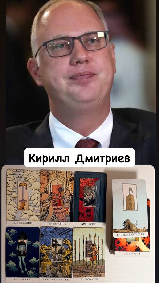 Суть карты Туз мечей вполне отражает прямолинейность Овна-Кирилла: конкретный, жесткий, хваткий, резкий. Такие люди хороши в переговорах, потому что умеют донести информацию так, чтобы не осталось никаких «а если», при этом могут быть приятны и коммуникабельны (паж кубков), хорошо считывают эмоции оппонент и чувствуют слабые места (10 мечей). Чего не достает характеру Дмитриева, так это отходчивости, таким людям есть что скрывать и не смотря на внешнюю дипломатичность, обиды он не забывает. Да и скелетиков предостаточно (9 кубков), Кирилл будет нравиться тем, кто может поддерживать уровень его возможностей (туз жезлов, 3 пентаклей), этот человек всегда ищет выгоду в первую очередь для себя, что вполне можно понять, живем-то один раз. В перспективе будет держаться уверенно в своих нынешних позициях (8 пентаклей), отстаивать и дальше интересы страны (9 жезлов), в которой ему комфортно (хотя родился в другой). Положение его довольно стабильно, но Паж кубков все же не Король, — Дмитриев