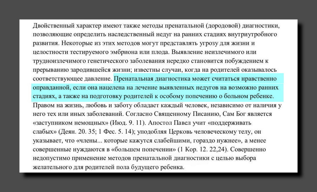 Очередные наставления от «посланников Бога» на Земле выглядят как разговор большого начальника с нерадивым персоналом: инструкции выдаются четко, возражения не принимаются, а за любую попытку подумать своей головой сразу обещают проблемы в «загробной жизни». Так, Синодальная комиссия по биоэтике подготовила документ, в котором заявили: современные методы диагностики часто используются «не с целью спасения зародившейся жизни, а напротив, избирательного прерывания беременности». По мнению церковников, заглядывать в геном будущего ребенка можно только в двух случаях: если его собираются лечить прямо в утробе или если родители хотят «подготовиться к рождению ребенка с заболеванием». Любые другие варианты считаются непотребством, которые осуждает небесная канцелярия. «Правом на жизнь, любовь и заботу обладает каждый человек, независимо от наличия у него тех или иных заболеваний». Звучит красиво, если не задумываться о том, на чьи плечи эта забота ложится в реальности. Однако в РПЦ уверены,