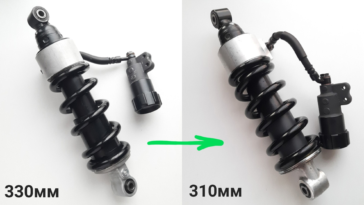 Как минимум вместе с амортизатором придётся менять также и линки, чтобы хоть как-то занизить подвеску, устремившуюся в небо с таким межосевым, как максимум Х версия этого амортизатора (330мм) вообще не установится без напильника, так как упрётся в маятник/прогрессию.