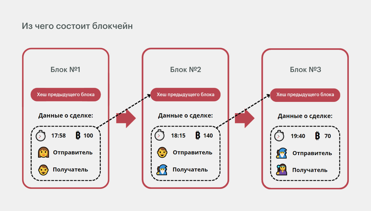 Представь себе обычную тетрадь, в которую несколько человек записывают общие расходы. Каждый видит все записи, никто не может тайно подправить цифры — потому что у всех одинаковые копии. Блокчейн работает примерно так же, только вместо тетради — цифровая база данных, а вместо нескольких друзей — тысячи компьютеров по всему миру. Само слово «блокчейн» переводится буквально: block — блок, chain — цепь. Это цепочка блоков с информацией. Каждый блок содержит пачку записей о каких-то событиях — например, о переводах денег — плюс уникальный код предыдущего блока. Из-за этой связи нельзя тихо изменить старый блок: его код изменится, и вся цепочка после него сломается. Ложь сразу становится заметна. Теперь о том, кто всё это хранит. В обычном банке есть один главный сервер — центр, которому все доверяют. Если этот сервер взломают или владелец решит подделать данные, никто снаружи этого не заметит. В блокчейне центра нет. Тысячи участников — их называют узлами — хранят одинаковые копии всей цеп