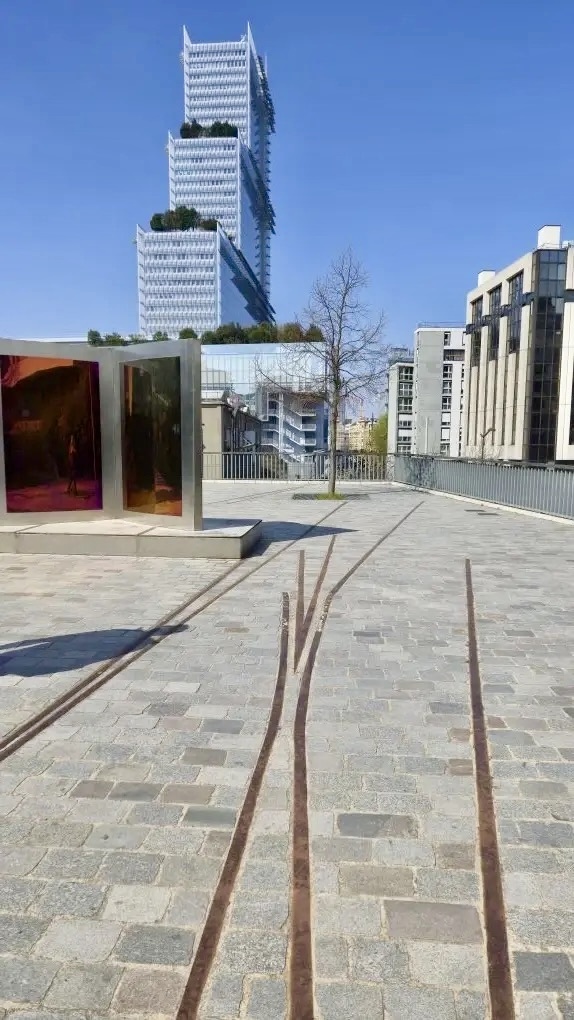 Рельсы, оставленные на мощёных дорожках, служат напоминанием о промышленном прошлом этой территории и символизируют движение и развитие. Они гармонично сочетаются с новыми пешеходными маршрутами и зелёными зонами, создавая уникальную атмосферу, где история встречается с современностью.