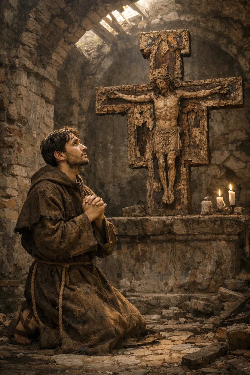 В полуразрушенной церкви Сан-Дамиано, перед древним распятием, Франциск пережил опыт, который перевернул его жизнь. Он услышал голос Христа: «Франциск, восстань и восстанови Мой дом».