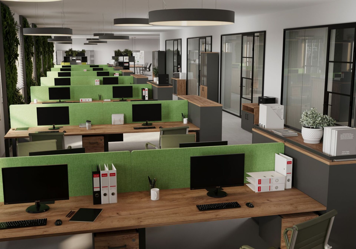 При планировании бюджета на новый офис одной из самых сложных задач является поиск баланса между визуальной эстетикой и функциональностью. В данном материале представлен детальный расчет на обустройство рабочего пространства для 30 сотрудников на базе коллекции Стайл Проджект в цветовом сочетании «Дуб Табак / Антрацит». Это решение относится к сегменту «бизнес-стандарт»: металлокаркас обеспечивает повышенную износостойкость, а современный декор — актуальный внешний вид. Для оптимизации полезной площади используются двухсторонние системы на едином каркасе (бенч-системы). Это позволяет компактно разместить сотрудников, сохранив визуальную чистоту линий и удобство обслуживания. Работа в открытом пространстве требует визуального разделения. Тканевые экраны создают личную зону и способствуют частичному поглощению фонового шума. Исключение хаоса из проводов под столами — критическое требование современной эргономики. Сетчатые кабель-каналы обеспечивают порядок и безопасность на каждом рабоче