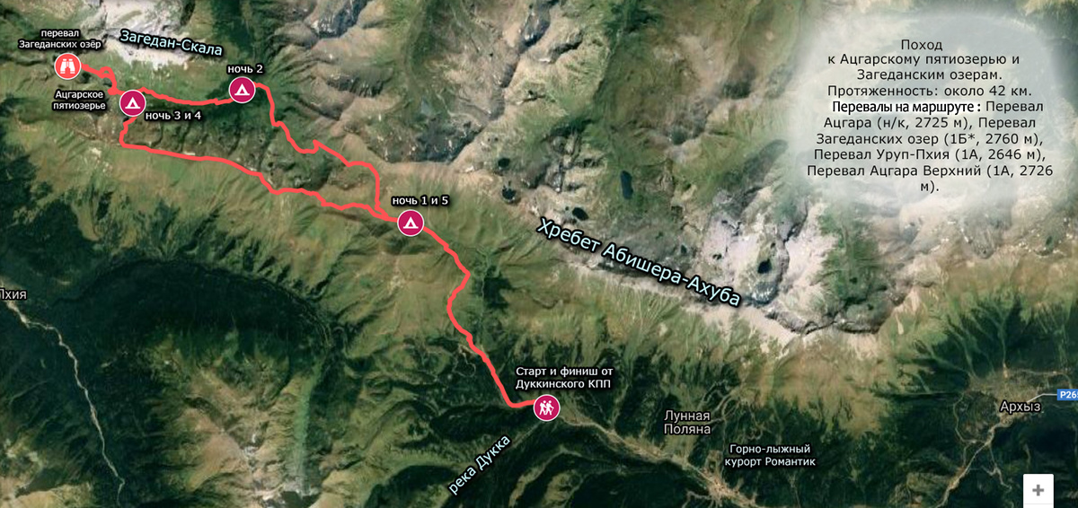 Полная нитка маршрута такая: палаточный лагерь Дукка - кош у горы Малая Речепста - перевал Ацгара - река Ацгара - Ацгарское пятиозерье - Загеданские озера (радиально) - перевал Уруп-Пхия - Загеданский хребет - перевал Ацгара Верхний - кош - шоссе Архыз-Пхия - Лунная поляна. Даты: 12-17 августа 2020г.