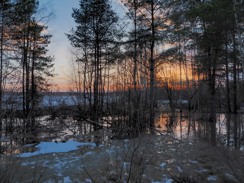 В предыдущем репортаже рассказал о том, как в последнее воскресенье марта проинспектировал реки на предмет ожидать ли в скором времени разливы рек. Понаблюдал Тезу в нескольких местах, и пришел к выводу, что половодье не за горами и начнется в ближайшие дни. Отмечу, что разливы это моя одна из любимых фотографических тем, и за более чем за двадцатилетний период увлечения фотографией это природное явление ни разу не пропустил. В последний день марта и первый день апреля совершил две вечерние поездки в село Дунилово, которое расположено на Тезе, и славится мощными разливами. О первом вечере и пойдет рассказ. Выезжал с работы, поэтому поспел в Дунилово аккурат к закату. По дороге сделал несколько снимков с закатными красками. Низины наполнились талой водой, которая в сочетании с остатками снега и льды рождали красивые виды. На открытом пространстве в поле поймал шикарный закат с расходящимися лучами солнца. Еще немного, и солнце скроется, поэтому надо было спешить в Дунилово. Оказался на
