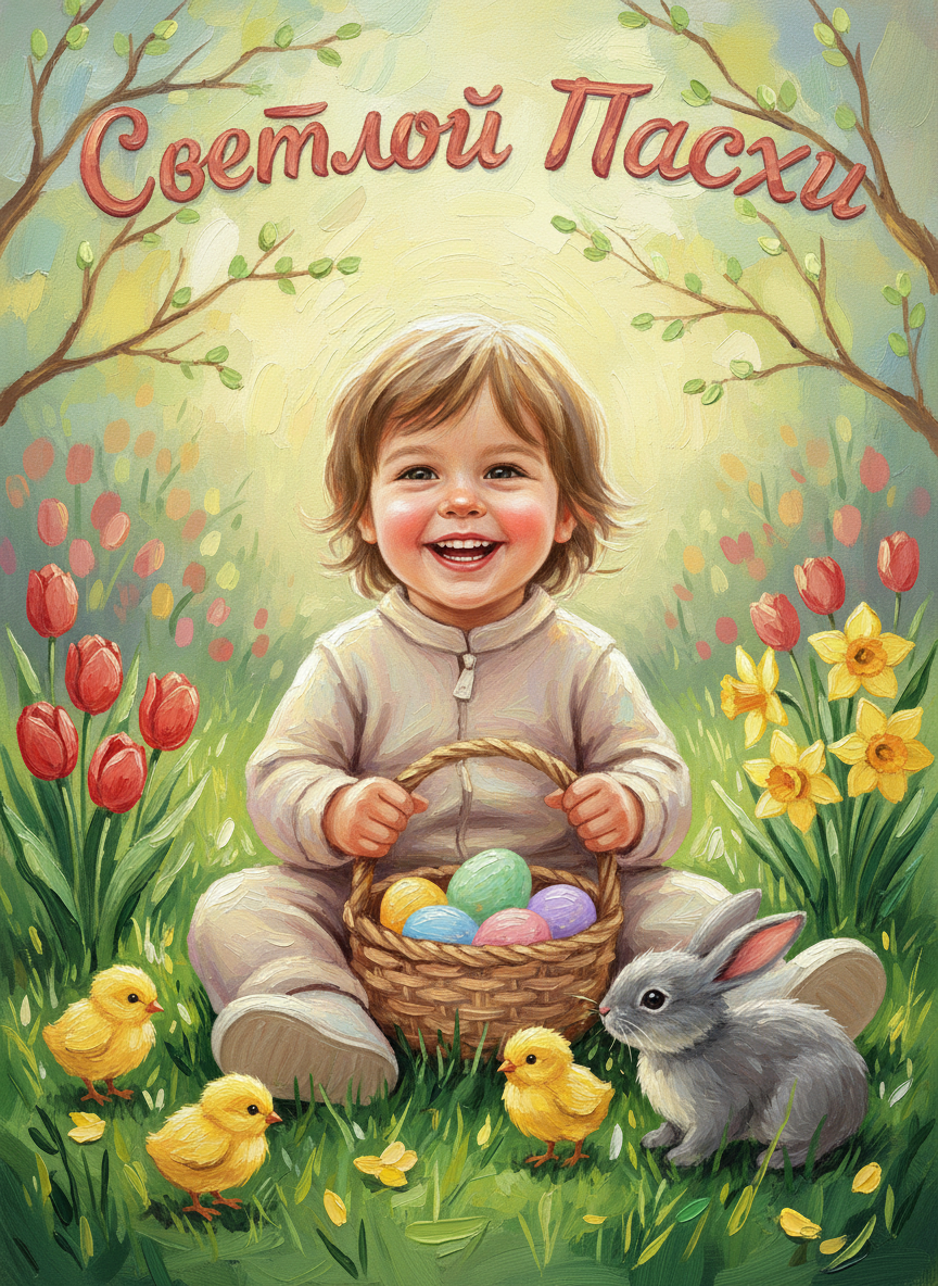Пасха уже совсем скоро, а значит, пора готовить поздравления для близких. Но вместо того чтобы пересылать старые картинки из интернета, можно создать что-то по-настоящему личное и тёплое. Сегодня я поделюсь промптом, который превращает обычное фото в объёмную акриловую открытку с густыми мазками и весенним настроением. ⚡️ Этот стиль сейчас на пике популярности в нейросетях: он выглядит не как холодная «цифра», а как живая работа художника, которую хочется потрогать. Акриловая живопись в нейросетях — это про фактуру и свет. Главная фишка здесь в имитации наслоения краски. Мы не просто просим «нарисовать картинку», мы задаём параметры «густых фактурных мазков» (impasto) и «видимых следов кисти». Это создаёт эффект объёма и делает изображение осязаемым. Для пасхальной тематики акрил подходит идеально. Его мягкая, слегка пастельная палитра в сочетании с яркими акцентами тюльпанов и нарциссов создаёт ту самую атмосферу пробуждающейся природы. В этом стиле даже лицо сохраняется очень естеств