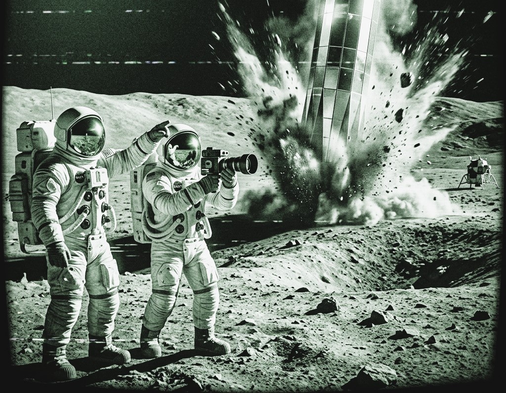 Спустя несколько минут после высадки, когда астронавты уже вышли на поверхность, произошло нечто невероятное. Примерно в ста метрах от них грунт начал подниматься, словно под ним что‑то шевелилось. Облако пыли окутало участок, а затем из‑под поверхности медленно поднялась металлическая конструкция — гладкая, геометрически правильная башня неизвестного происхождения. Её поверхность переливалась в лучах низко стоящего Солнца, отражая свет странными радужными бликами.