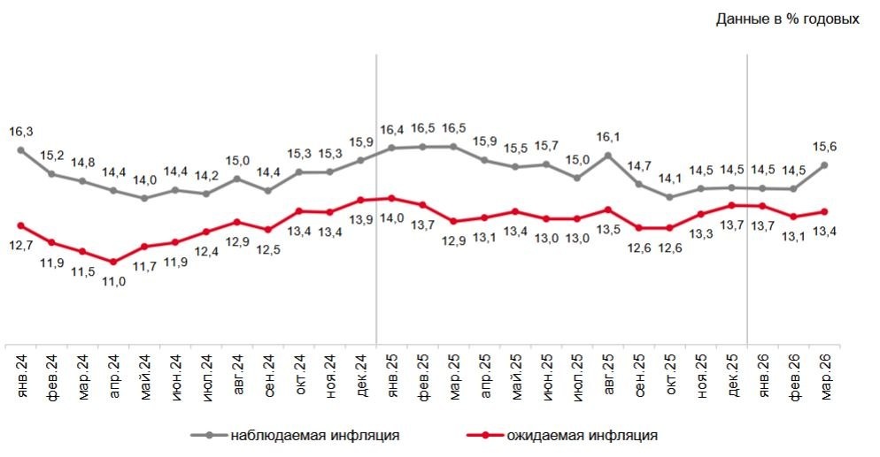 Минэкономразвития выдало оценку динамики ВВП в феврале. 📷 Официально всё плохо, спад продолжается: в феврале -1,5% г/г после -2,1% г/г в январе. Впрочем, Минэкономразвития сразу поправилось, списав это на календарный фактор (в январе было на 2 рабочих дня меньше, чем в прошлом году, в феврале — на 1), и поспешило заявить, что в феврале ВВП остался на уровне января (сезонно сглаженный). Выглядят все эти оправдания притянутыми за уши. Как 1 из 247 рабочих дней года (0,4% рабочего времени) мог привести к спаду ВВП в 1,5%? Но никаких других причин спада Минэкономразвитие по-прежнему называть не хочет. Между тем, после неудачного 2025 года, пора уже предпринимать какие-то серьёзные действия. Даже скрывать спад обычным путём занижения индекса цен уже не удаётся. Официальная инфляция и так уже неправдоподобно низка: 5,91% г/г в феврале и 5,86% на 30 марта. Трудно поверить в эти цифры после скачка инфляции в январе из-за роста НДС и других налоговых изменений. Ведь новый НДС никуда не делся,