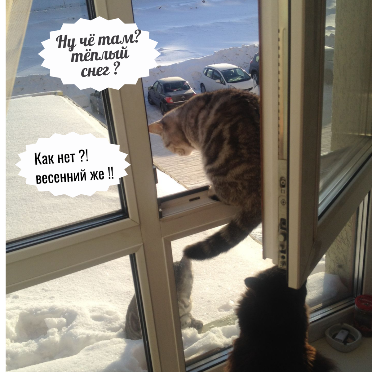 Утро в базовом лагере, началось в предвкушении великих приключений. Биологические часы капитана Барбариски (полосатой исследовательницы подоконников) и младшей помощницы Буси, синхронно пробили ,,весна!,, План был идеален. Экспедиция должна была начаться ровно в 8:00 по кошачьему времени. Цель: выйти на козырёк, вдохнуть аромат пробуждающейся природы, выследить первую, еще сонную муху и, если повезёт, совершить героический забег по свежей травке. Буся притаилась внизу, прикрывая тылы и сканируя периметр. Она уже чувствовала себя дикой пантерой в джунглях. Но стоило выпрыгнуть наружу, как суровая реальность ударила ледяным ветром. Вместо весенних ручейков, перед отважными любительницами приключений, раскинулась бескрайняя белая пустошь. Сугробы возвышались как неприступные горы. Вдруг внизу, среди снежных барханов, показалось странное движение. Это был не голубь. И даже не соседская собака. К окну, утопая по колено в снегу, пробирался странный пухлый шарик. Пингвинёнок ! В его лапка