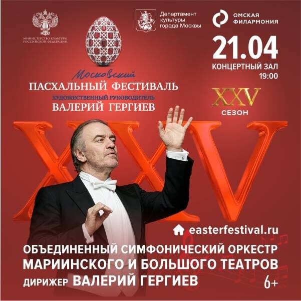 XXV Московский Пасхальный фестиваль с объединенным оркестром Мариинского и Большого театров под управлением Валерия Гергиева. Программа посвящена юбилеям Сергея Прокофьева и Дмитрия Шостаковича. Начало: 21 апреля 2026 19:00 Стоимость: Не указана Адрес: г Омск, ул Ленина, д 27А Организатор: https://vk.com/public13443001 XXV Московский Пасхальный фестиваль порадует омичей и гостей Культурной столицы-2026! Московский Пасхальный фестиваль давно стал для омской публики событием, которого ждут с особым трепетом. Из года в год он подтверждает свой статус одного из самых значимых музыкальных форумов страны. Юбилейный, 25-й сезон фестиваля обещает быть рекордным по масштабу и насыщенности программы. Особое место в афише займет масштабное... #общество_традиции #развлечения_классическая_музыка Узнать подробности, адрес или записаться на событие.