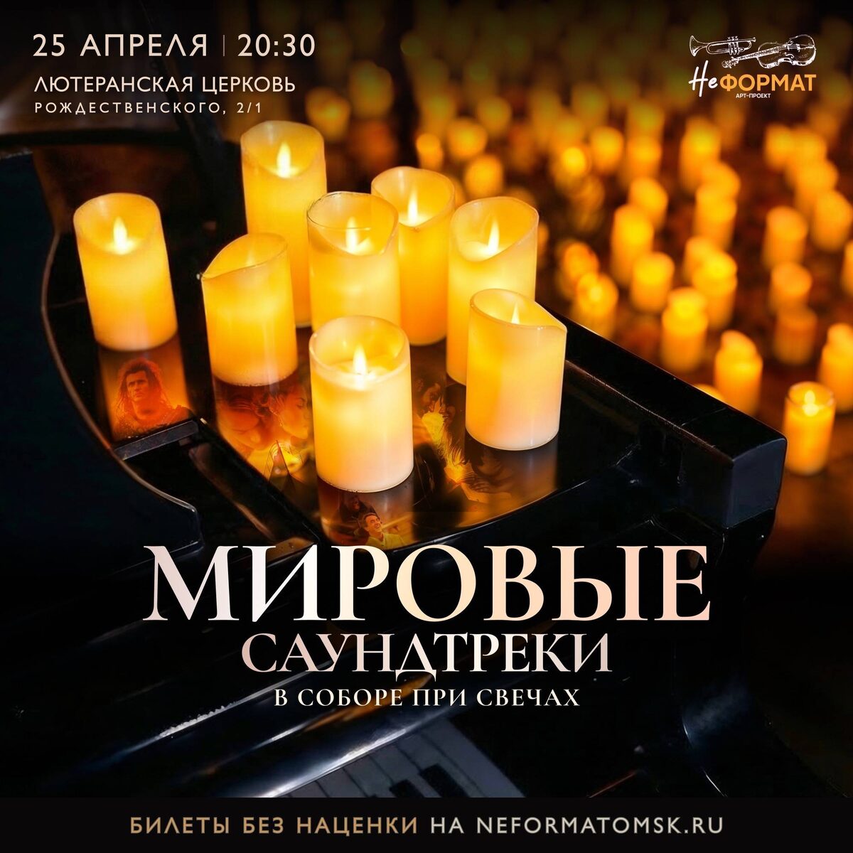 Концерт саундтреков из фильмов в атмосфере сотен свечей с участием музыкантов. Программа включает композиции из "Интерстеллар", "Титаник", "Телохранитель" и других. Начало: 25 апреля 2026 20:30 Стоимость: От 1800.0 руб. до 3500.0 руб. Адрес: г Омск, ул. Рождественского, 2/1 Организатор: https://vk.com/public155923523 Большинство слушает саундтреки неправильно. В машине — они маскируют шум дороги. В наушниках на бегу — задают ритм, но не трогают. Дома — становятся фоном для уборки. Единственное место, где саундтрек звучит так, как задумано, — это кинозал. Но кинозал не даёт вам тишины между нотами. А есть место, где тишина становится частью музыки. Сотни свечей. Сплоченный коллектив музыкантов. Программа, в которой нет случайных... #зрелищные_искусства_кино__и_видеосъемка #творческое_развитие_музыка Узнать подробности, адрес или записаться на событие.
