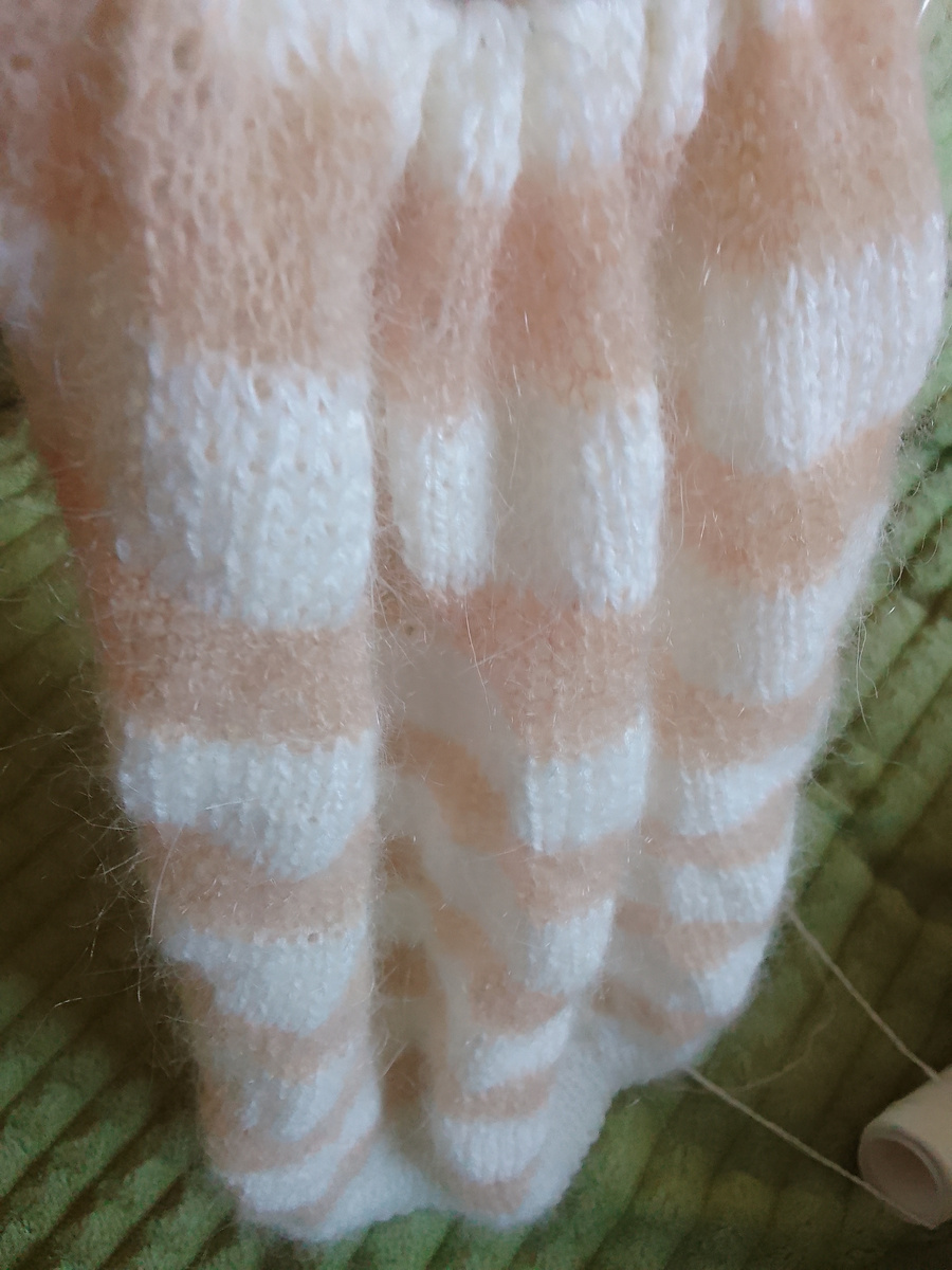 Ниточки очень тонкие, вяжу на спицах тройке, рядочки получаются не очень ровные, но они не портят вид мне кажется, он ещё распушится после стирки, белые нитки это козий пух, бежевые мохер