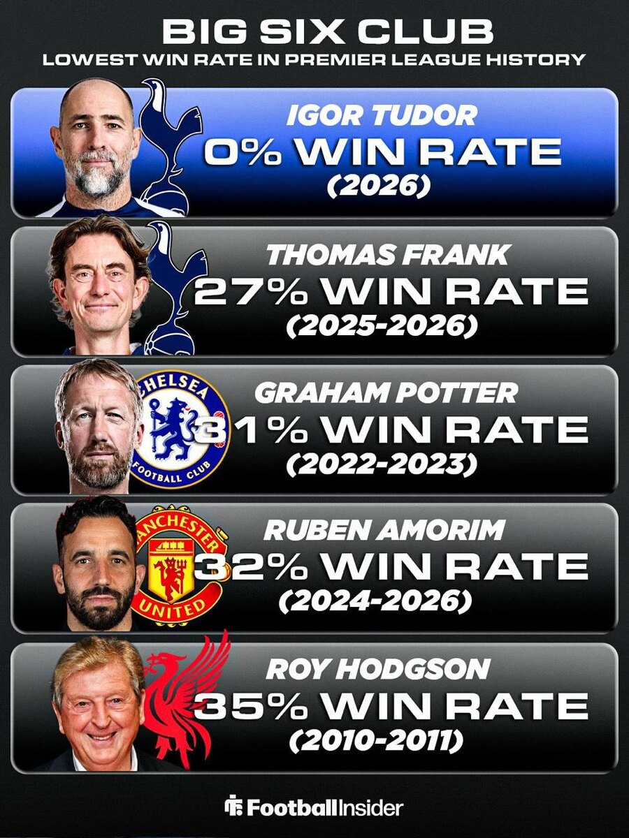 Худшие тренеры команд "большой шестерки" по доле выигранных матчей в Премьер-Лиге за всю историю 📊