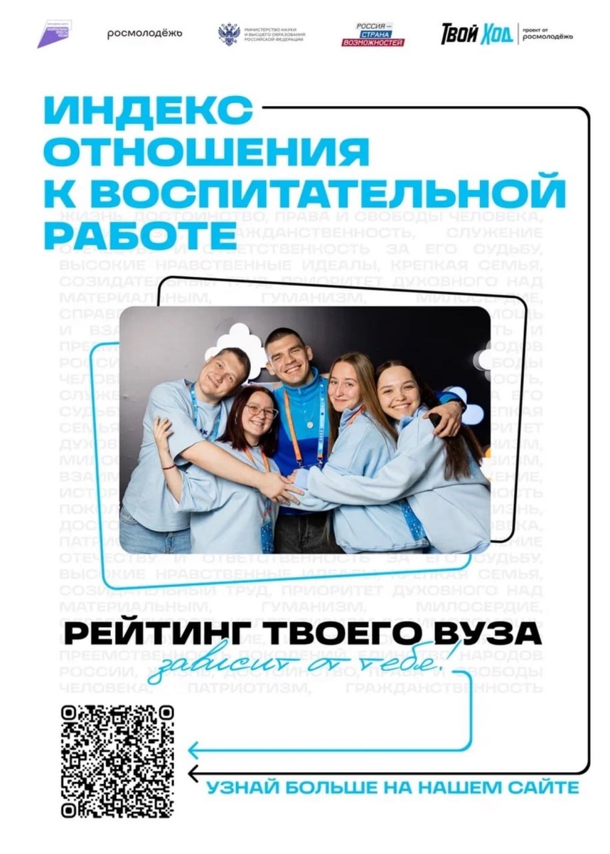 💫 Всероссийский студенческий проект «Твой Ход» , совместно с Министерства образования и науки России дали старт нового сезона Индекса отношения к воспитательной работе (рейтинг «Твой Ход») - инструмента, позволяющего студентам дать обратную связь о том, как университет способствует личностному развитию, организации внеучебной деятельности и участию в жизни студенческого сообщества. За четыре года участия КГУ в Индексе его участниками стали 2 487 студентов💙 Полученные результаты используются для оценки эффективности воспитательной работы и принятия управленческих решений, направленных на развитие студенческой среды с формированием рейтинга вузов по единой методике. Для того чтобы ваше мнение было учтено, необходимо пройти опрос на платформе Проекта. 🖇 КГУ в MAX
