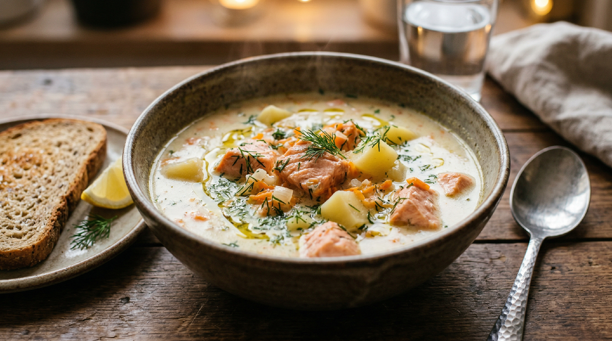 Произошло это пару лет назад, в обычный будний вечер. Я пришла с работы уставшая, в холодильнике лежали стейки кеты, купленные накануне без особого плана. Хотела просто запечь их в духовке, но домашние попросили суп. Горячий, сытный, чтобы согреться — на улице стоял промозглый ноябрь. Я открыла холодильник и стала думать. Стейки кеты, картошка, лук, морковь, пачка сливок десятипроцентных, зелень. Вроде бы набор для какого-то сливочного супа, подумала я. А почему бы, собственно, не попробовать?