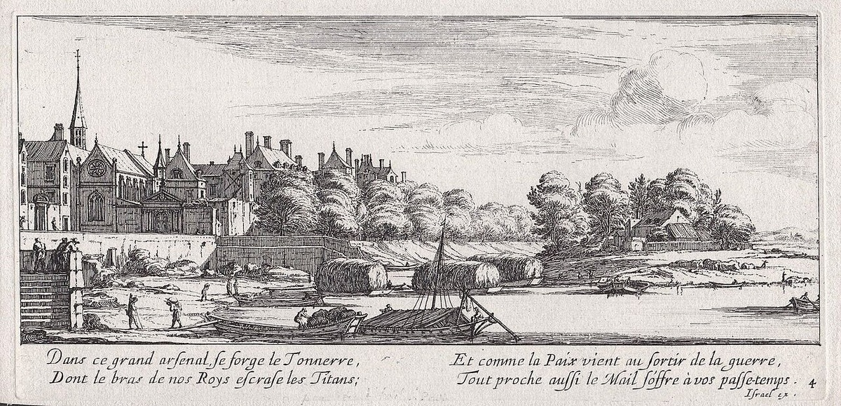 Помимо использования в качестве склада военной техники, Парижский арсенал также служил резиденцией Grand maitre de l’artillerie / Великого магистра артиллерии. Он был основан Франциском I и построен Филибером де Л’Ормом (1514-1570) под руководством герцога де Сюлли в XVI веке. Герцог Мэнский, внебрачный сын Людовика XIV, расширил покои, наняв для этих работ архитектора Жермена Бофрана (1667-1754). Бофран построил крыло, выходящее к реке, и спроектировал павильон герцогини Мэнской. Его эскизы оформления салона представляют собой схему, перекликающуюся со стилем Людовика XIV, созданные, несомненно, в рамках кампании по утверждению прав на престолонаследие. На военную роль герцога де Мена намекает изображение богов Беллоны и Марса среди трофеев и различных других символов войны, а его права как наследника французского престола подкрепляются фризом, населенным мифологическими персонажами, визуально подчеркивающими генеалогию, уходящую корнями в античность.