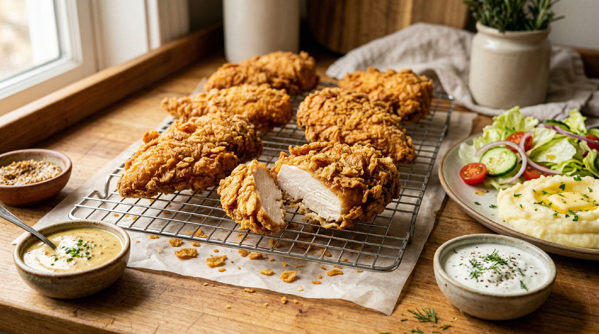 Кукурузный крахмал — это тот ингредиент, который реально меняет правила игры, когда речь идёт о жареной курице. Он дешёвый, доступный, простой в использовании, и результат с ним кардинально отличается от привычной мучной панировки. Два часа стабильного хруста — это не рекламная уловка и не преувеличение. Это работает, и работает надёжно, если соблюдать несколько простых правил: сухая двойная панировка, правильная температура масла, не слишком много кусков одновременно на сковороде и решётка вместо бумажного полотенца для готовых кусочков.