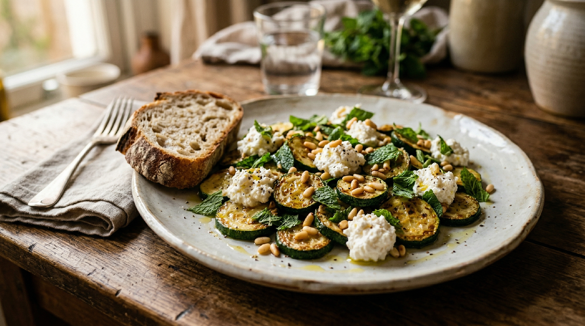 Подаём сразу, пока кабачки ещё тёплые, а мята свежая. Это важно: салат не из тех блюд, которые можно приготовить заранее и поставить в холодильник. Его прелесть именно в контрасте температур — тёплые кабачки, прохладная рикотта, свежая мята.