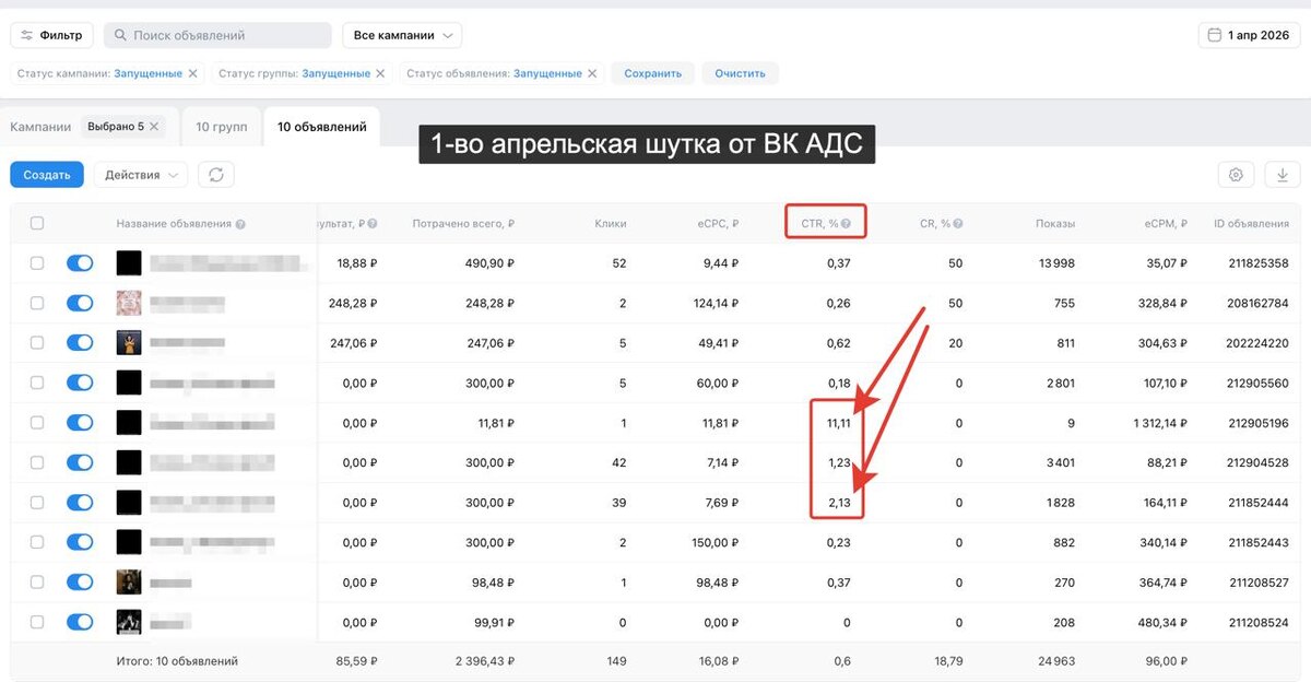 Вчера было 1 апреля. И статистика взбесилась. 11% CTR не видел миллион лет. Самое смешное, что заявок не было с этих крео, только огромное кол-во кликов. Мы видим аналитику на сквозь, поэтому приводим заявки, а не клики. Что-то происходит с ВК, думаю скоро сломается или починили что-то, но пока не до конца. 👉 Приводим заявки из ВК - Заказать продвижение Тут и собаку съели и прокачались до уровня, когда генерируем заявки каждый день.