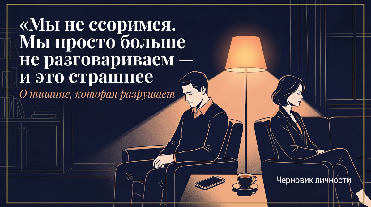Нас все считают крепкой парой. Семь лет вместе. Совместная ипотека, выплаченная досрочно. Дочка. Совместные отпуска. Ни одного громкого скандала - соседи за стеной, наверное, даже не догадываются, что у нас вообще бывают разногласия. И правда - мы не скандалим. Мы вежливы. Мы нормально делим быт. Мы оба хорошие родители. Мы просто перестали разговаривать. Не по-настоящему. Не так, как разговаривали в первые годы - когда засиживались до двух ночи, спорили о чём угодно, смеялись над одними и теми же вещами, и я точно знала, о чём он думает, ещё до того, как он открывал рот. Теперь я иногда смотрю на него за ужином и понимаю: я не знаю, что у него внутри. И он - не знает, что у меня. Мы живём рядом. Но мы давно не вместе. Я долго не давала этому название. Потому что называть - значит признавать. А признавать было страшно. Если нет скандала, нет измены, нет явной причины - значит, всё нормально, правда? Значит, так и должно быть. Значит, это просто «притёрлись», «устоялись», «взрослые люди