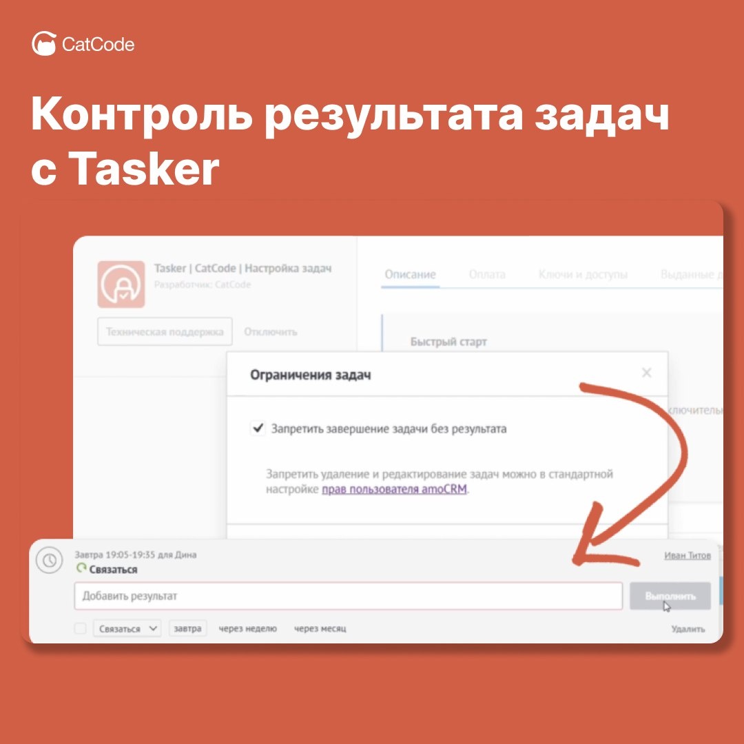 Tasker не позволит закрыть задачу без заполненного результата. ⚡ Обязательное описание результата ⚡ Защита от ошибок и пропусков ⚡ Гибкие настройки ⚡ Улучшение коммуникации и аналитики ✉ Если остались вопросы — пишите, будем рады помочь! #tasker@catcode_news