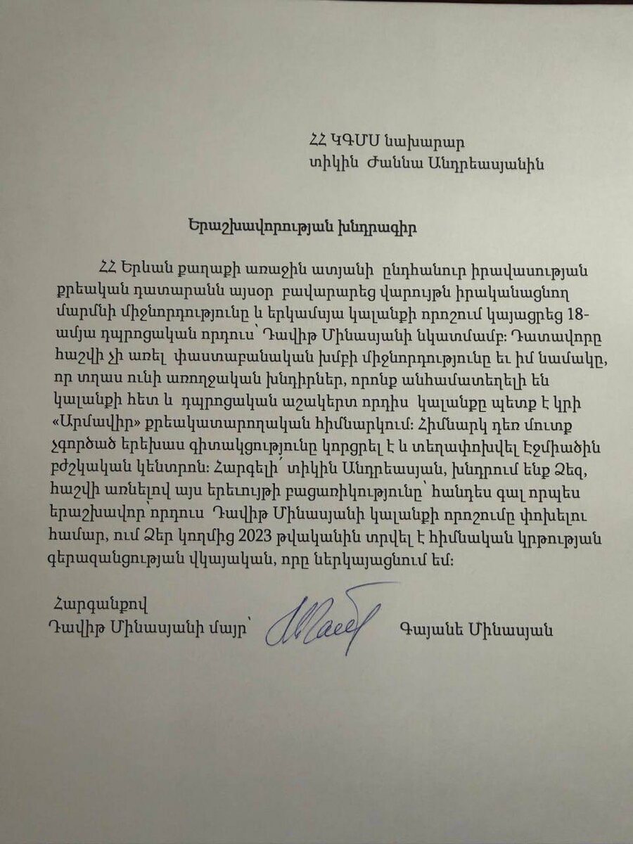 , դիմել է ՀՀ ԿԳՄՍ նախարարին, խնդրել տալ երաշխավորություն։ Այդ մասին տեղեկացնում է փաստաբան Լուսինե Մարտիրոսյանը։