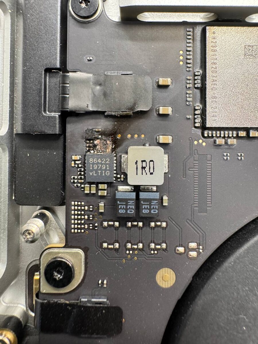 MacBook Pro 14” A2442 на М1. “Коротнулся” керамический конденсатор, сгорел, поджег текстолит. До и после ремонта.