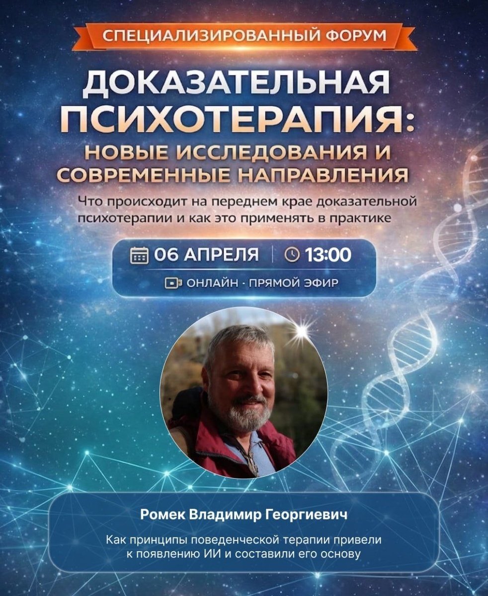 » 👨⚕ Ромек Владимир Георгиевич - психолог, клинический психолог, кандидат психологических наук, доцент 📝 Тема выступления: "Поведенческая и когнитивная терапия в эпоху искусственного интеллекта" Как связаны психотерапия и алгоритмы ИИ? Почему принципы, разработанные для понимания человеческого поведения, сегодня лежат в основе машинного обучения? На лекции Вы: 📎 узнаете, как идеи когнитивной и поведенческой терапии «перекочевали» в современные системы искусственного интеллекта 📎 по-новому взглянете на обучение и поведение — от человека до «обучающей машины» Б. Ф. Скиннера 📎 разберётесь, где работают механизмы оперантного обусловливания, а где их возможности принципиально ограничены Эта лекция — возможность увидеть, как психология и технологии неожиданно сходятся в одной точке Ждем Вас на встрече! 📅 6 апреля 🕚 начало конференции в 11:00 Выступление Ромека В.Г. 13.00 по МСК 💻 формат: онлайн Регистрация https://cbtclinic.education/evidence-based-psychotherapy