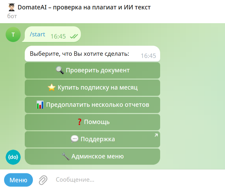 Без регистрации в Думейт работает два вида проверок – это проверки в Телеграм-бот и в Макс-бот. Для пользователя проверка проходит внутри мессенджера и не требует введения каких-либо дополнительных данных о себе. Дальше покажем процесс на примере Телеграм, т.к. реализация и условия одинаковые в обоих мессенджерах. На первом шаге нужно войти в бот и запустить его. Через скрепочку загрузить документ, он сразу уйдет на проверку. Ограничений по объему в сервисе нет, но вот в Телеграм невозможно отправить документ более 20МБ, это нужно учитывать. Формат документа: txt, html, docx, doc, rtf, odt, pdf. Проверка сразу идет по все базам, как в вузе. По факту проверки бот пришлет сообщение и результаты. Таких проверок для каждого пользователя бесплатно три штуки без каких-то дополнительных условий. Дальше либо вы понимаете, что результат вас устраивает и можете ничего не делать. Либо к можно купить полный отчет и посмотреть на эти параметры уже более детально. Полный отчет всегда платный, но сто