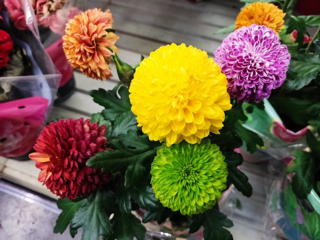 Первое. Разноцветные хризантемы в одном горшке 5 сортов