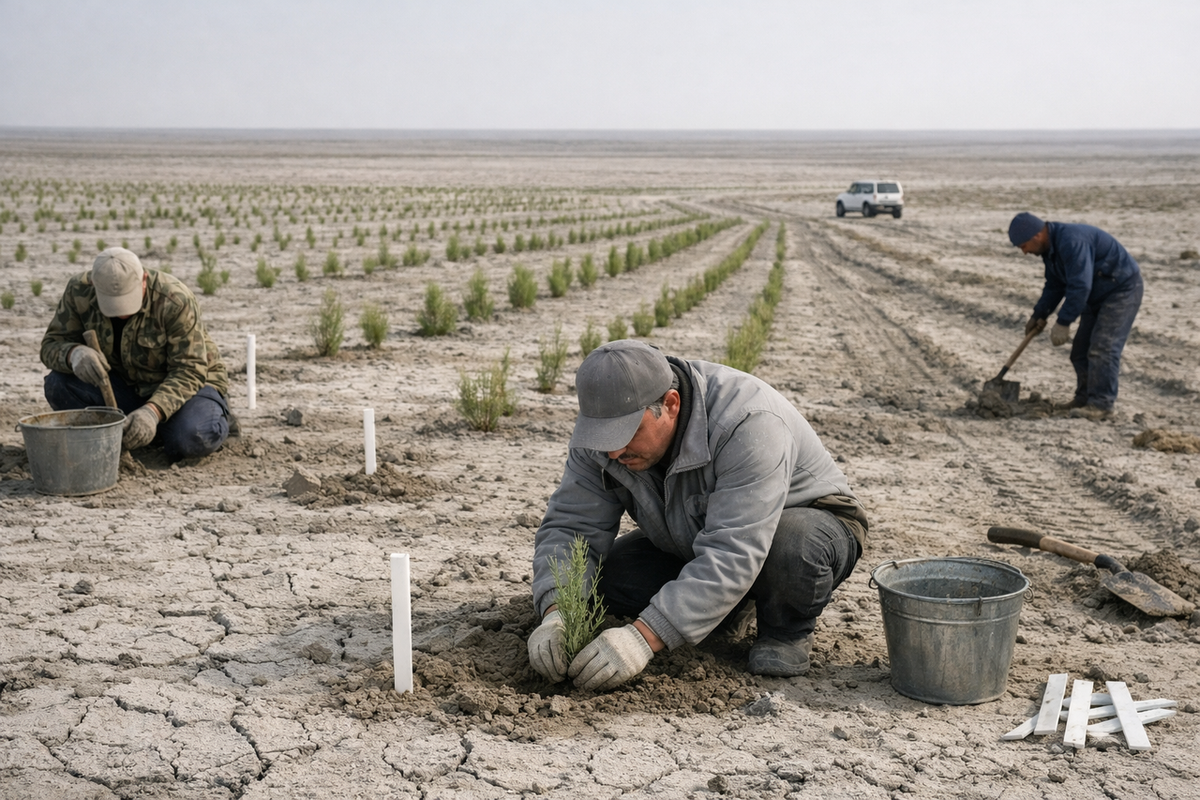В этих условиях лесное хозяйство приобретает новую функцию — оно становится инструментом защиты инфраструктуры и населения. Речь идет не о классическом лесовосстановлении, а о создании защитных экосистем, способных фиксировать почвы, снижать скорость ветра и удерживать влагу. По оценкам узбекских специалистов, посадка саксаула и других засухоустойчивых культур на площади 1 миллион гектаров позволяет сократить пылевые выбросы на 15–20 процентов. Уже к 2025 году в стране было озеленено более 1,7 миллиона гектаров высохшего дна Аральского моря, что делает Узбекистан одним из лидеров по масштабам экологических восстановительных работ в регионе.