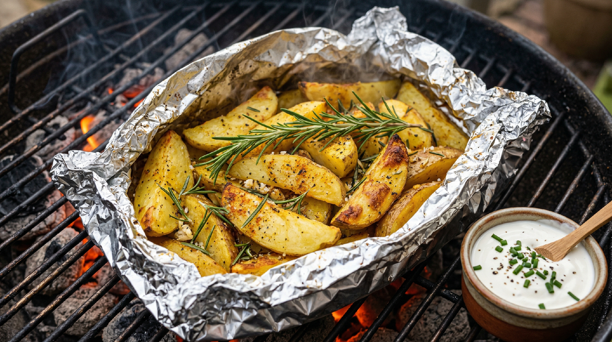 Фольга решает все эти проблемы разом. Она создаёт замкнутое пространство, внутри которого картошка одновременно и печётся, и немного тушится в собственном соку. Жар распределяется равномерно, ничего не подгорает, не сохнет, не вываливается в золу. А самое главное — в этом замкнутом пространстве розмарин и специи отдают свой аромат гораздо интенсивнее, чем на открытом воздухе. Получается эффект, чем-то похожий на духовку, только с лёгким привкусом дымка от мангала.