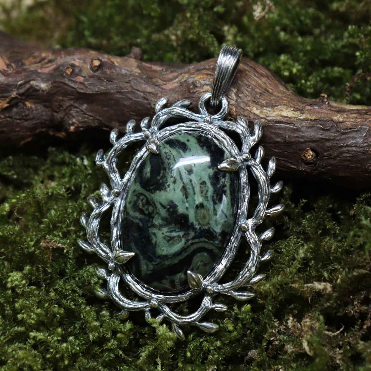 Уже нашел хозяйку, поэтому просто полюбуемся на его фото в деталях 🌿 Приятный случай, когда камень сам вдохновил на создание именно такого кулона в оправе из вьющихся ветвей, изгибы которых украшены небольшими листочками и капельками росы. Когда моделировала оправу, представляла изящные ветви плюща или даже тропические лианы, обвивающие стволы. Узоры камня напоминают игру света под густыми кронами лесных деревьев, где на мягком моховом ковре тени движутся в своем неспешном танце. Яшма Камбаба или, как ее еще называют, крокодиловая яшма, на самом деле не является классической яшмой в привычном понимании, поэтому такое название используется для упрощения и как торговое наименование. На самом деле это горная порода, состоящая из амфибола, полевого шпата, кварца и других включений. Встречала упоминания, что такой камень относят к риолитам, хотя иногда называют просто амфиболит. В общем, мне кажется, тут самое главное, что это очень интересный и необычный натуральный камень с завораживающи