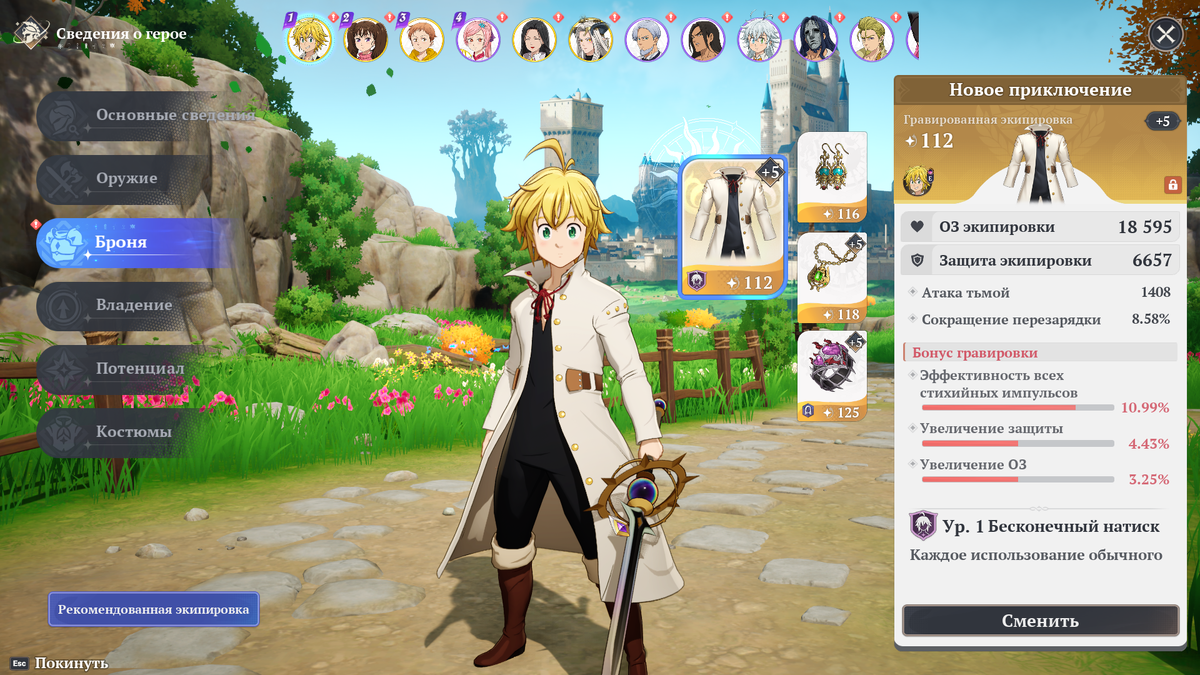 Гравировка - особый вид экипировки, доступный после прохождения Act 1-65. Она создаётся у специальных NPC, заменяет сразу 4 слота брони (верх, штаны, пояс, обувь), даёт уникальные усиления для конкретного героя и открывает соответствующий скин. Вся информация о том: находится в отдельном подробном руководстве: Там же есть чек-лист для отслеживания фарма. В игре бонусы гравировки до крафта не видны. Чтобы вы могли планировать вложения заранее, мною составлена таблица со всеми сетами: 7DS: Original таблица всех гравировок и их свойств Гравировки крафтят не «на всех подряд», а только на тех, кто реально играет в вашем основном составе. Система дорогая по материалам, а сами предметы жёстко привязаны к герою. Приоритет: Универсальная гравировка для всех форм Мелиодаса. Усиливает атаку, даёт дополнительный урон, сокращает перезарядку способностей и бонусом откатывает шкалу метки. Лучший выбор, если вы играете на Мелиодасе. Благодаря 5 стакам пассивки и этому сету Диана в себе сочетает р