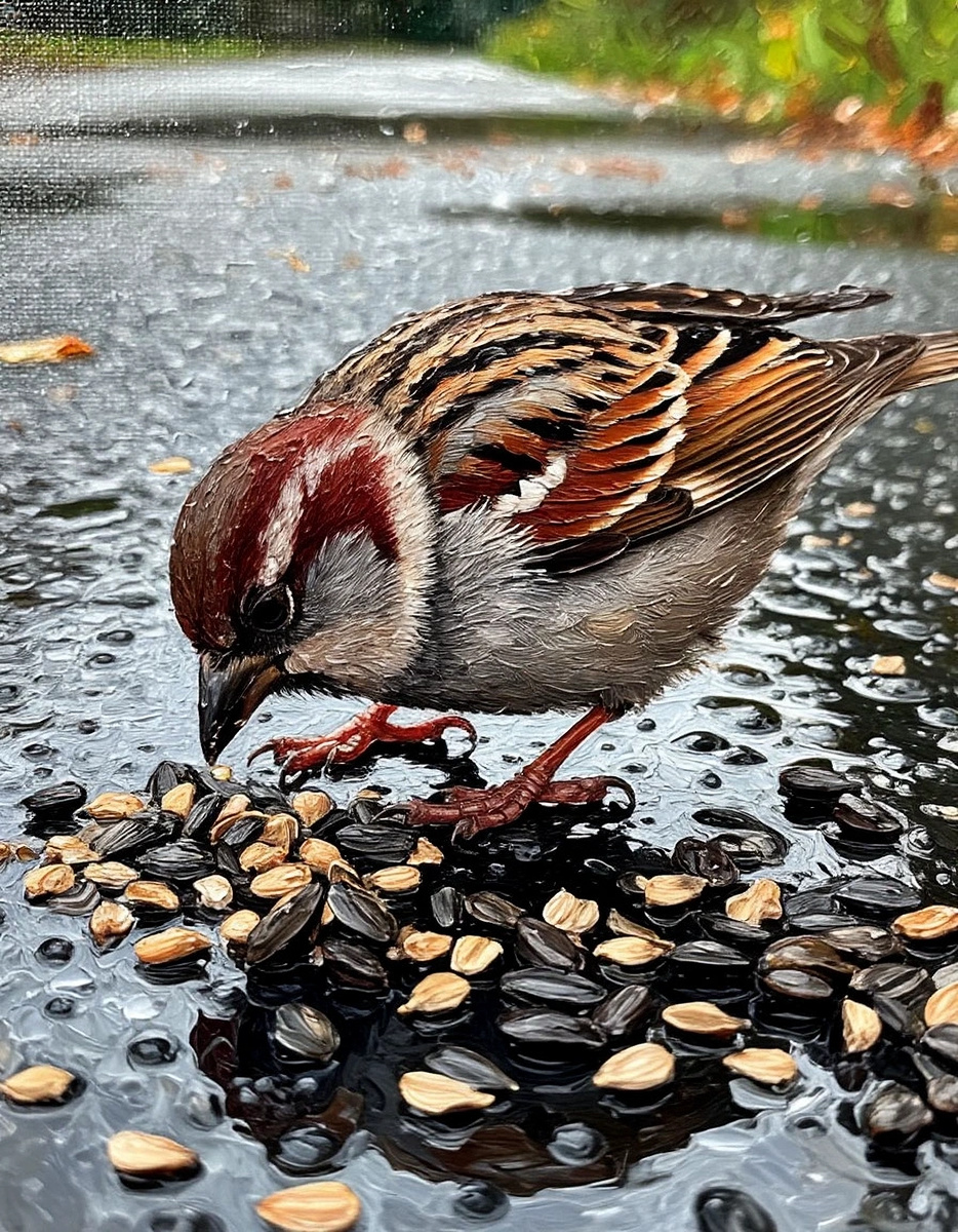 «Масляная живопись в технике импасто: крупный план — воробей клюёт семечки, рассыпанные на мокром асфальте. Толстые фактурные мазки подчёркивают перья птицы, шероховатость семечек и лужицы от дождя. Капли на крыльях воробья, блики на мокрой поверхности. Серо‑коричневая палитра с акцентами рыжего и чёрного. Видимые мазки кисти, объёмная текстура краски. Естественное освещение, мягкий рассеянный свет. Высокая детализация, глубина резкости, атмосфера дождливого дня» Вариант 2 (экспрессивный стиль, 394 символа):