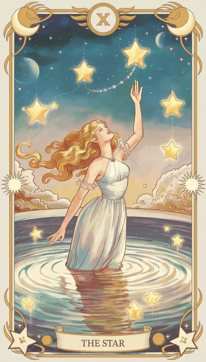 Сядьте удобно. Представьте, что перед вами — Туз Кубков: из него льётся серебристая вода. Вы пьёте её, и всё внутри наполняется нежностью. Затем поднимите глаза: в небе горит Звезда, её луч касается вашей макушки. Прошепчите: «Я верю». Посидите так 3 минуты.