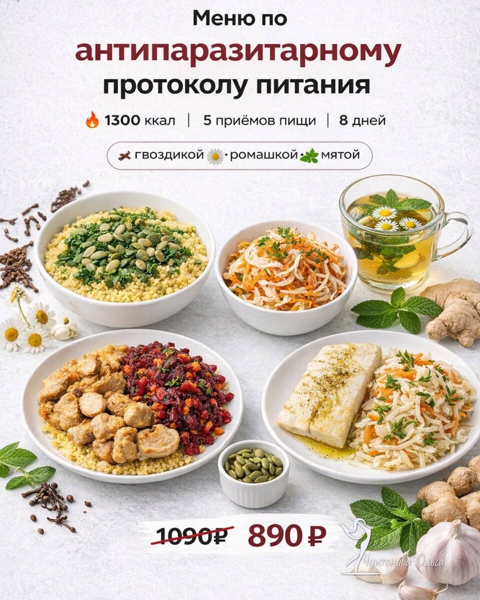 Если вес не снижается, несмотря на контроль питания и физическую активность, причина чаще всего не в калорийности рациона. На практике это задержка жидкости, воспалительные процессы, нарушения работы желудочно-кишечного тракта и снижение чувствительности к инсулину. В таких условиях организм не отдаёт вес даже при дефиците калорий. Антипаразитарный протокол питания — это не жёсткая диета, а структурированная система, которая снижает нагрузку на ЖКТ, поддерживает детоксикационные процессы, уменьшает воспаление и нормализует пищевое поведение. За счёт этого уже в первые дни уходит отёчность, уменьшается объём, появляется ощущение лёгкости. Физиологически это связано со снижением задержки жидкости, уменьшением воспалительных реакций и стабилизацией уровня глюкозы и инсулина. Результат — снижение массы тела и улучшение общего самочувствия. Формат программы: 1300 ккал — оптимальный дефицит без стресса для организма, 5 приёмов пищи — стабильный уровень энергии и контроль аппетита, 8 дней