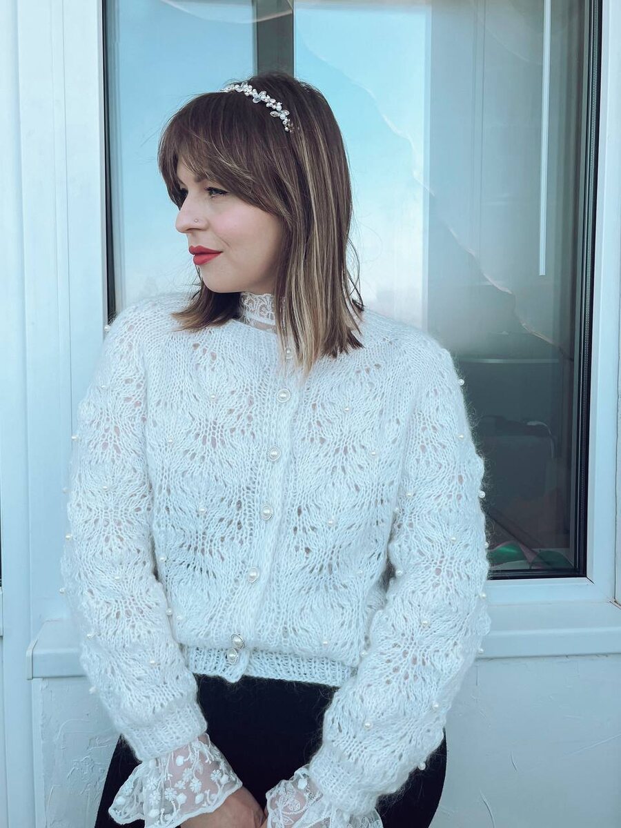 Роскошество в студию! Хожу нарядная по врачам. Потому что мы с одного больничного на другой. Кофта из мохера получилась супер тёплая, несмотря на ажурный рисунок. Такая всесезонная вещь должна быть в гардеробе однозначно. Летним вечером на платье накинуть, весной на футболку я под куртку одевала. Зимой прям в морозы под пуховиком будет греть. Мохер в две нити 6-7 мотков на спицах 6 мм, 9 пуговиц, 92 бусины, блузка с Али