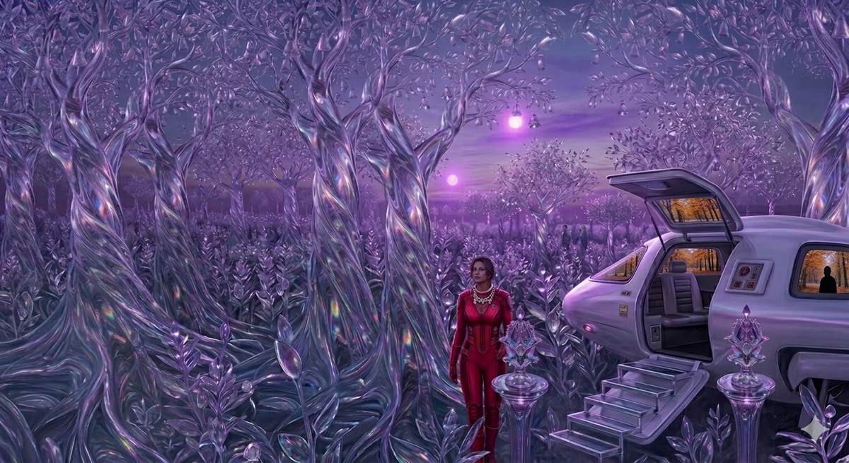 Первое, что она увидела — лес. Но лес из стекла. Стволы растений переливались на свету двух маленьких фиолетовых солнц, а листья звенели при малейшем ветре, как тысячи крошечных колокольчиков. Красиво. Опасно красиво.