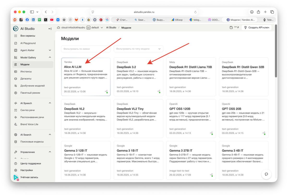 Облаке. Я не работал с Alice AI LLM, интересно попробовать, но наличие DeepSeek-V3.2 и gpt-oss-120b радует! Буду держать в курсе, как у нас двигается. Ребята говорят, что gpt-oss-120b отвечает у Яндекса моментально. @clickfraud.ru