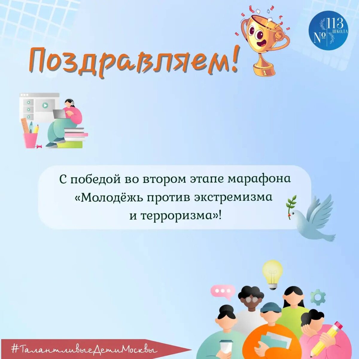 »! 👍С гордостью сообщаем, что наша команда 8 -х классов под руководством Шорваевой Елены Николаевны и Адонии Юлии Константиновны стала победителем во втором этапе марафона «Молодёжь против экстремизма и терроризма»! ☝️Этот марафон — не просто соревнование, а важное напоминание о том, что вместе мы можем противостоять любым угрозам. Ребята показали свои знания, сплочённость и готовность отстаивать мир и безопасность в нашем обществе. 🙏Спасибо всем, кто поддерживал и верил в победу нашей команды! Вместе мы — сила! 💪Финал уже близко! Желаем вам невероятной удачи и блестящей победы! Мы в вас верим! #ДОНМ #Школа113 #ТалантливыеДетиМосквы