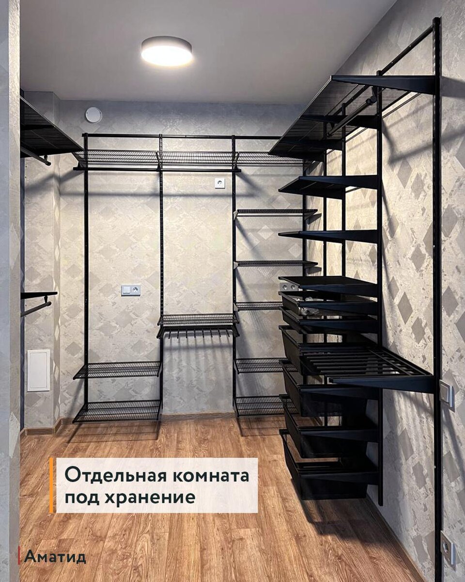 В такой гардеробной легко разместить одежду, обувь, сумки, чемоданы и сезонные вещи, и все просто найти на своих местах. Мы проектируем гардеробные под конкретные задачи. Менеджеры заранее продумывают наполнение: — сколько места нужно под короткую и длинную одежду; — где удобнее хранить обувь и аксессуары; — как использовать стены и углы, чтобы не терять полезные сантиметры. От вас — минимум действий: 1) фото или видео помещения с размерами; 2) назначение гардеробной (для семьи, для одного человека, сезонное хранение и т. д.); 3) список вещей — общий или подробный, как вам удобнее. Проект подготовим в течение дня. Организуем замер (Санкт-Петербург и область, Москва и область). Установка — через 1–3 дня после оплаты. •Консультируем здесь @Amatidru •Или по тел.: +79219170608 •3 салона СПб, монтажные бригады СПб и Мск •Отправляем в другие города •Можно купить в рассрочку