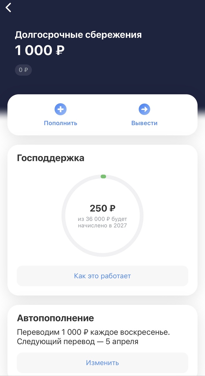 Недавно я открыла счёт долгосрочных сбережений в Т Банк и решила поставить себе цель: каждую неделю, по воскресеньям, буду откладывать по 1000 рублей с помощью автопополнения.