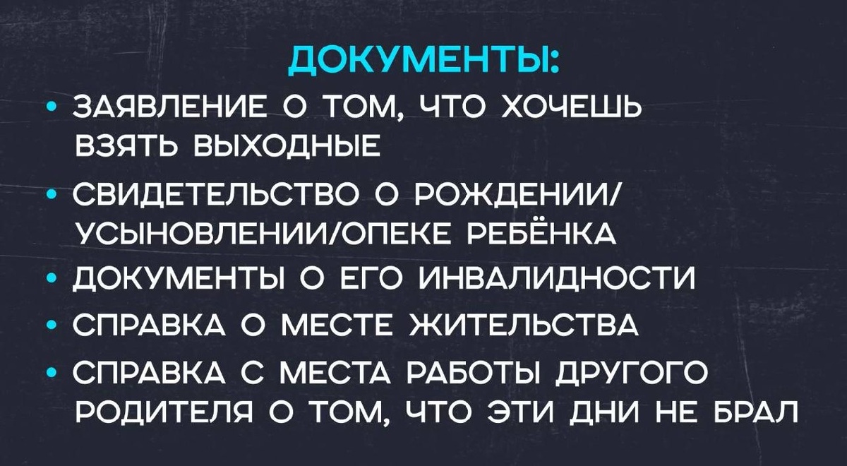 Эти дни — оплачиваемые. Накопить и использовать за раз можно 24 выходных — по согласованию с работодателем. Дополнительные дни отдыха предусмотрены суммарно для обоих родителей. То есть 48 дней папа и мама могут поделить между собой, или их возьмёт кто-то один.