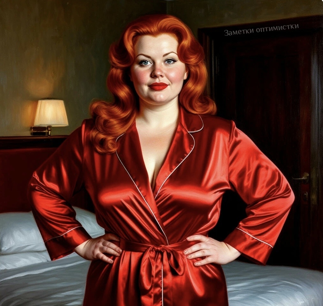 Вдруг из ванной комнаты вышла женщина. В красном пеньюаре, на ногах туфли на высоченных каблуках. Длинные рыжие волосы, красная помада на губах. И щёки нарумянила как матрёшка. Рыжая бестия приближалась к Геннадию. Он начал пятиться и уселся на широкую кровать, застеленную пледом. Ноги аж ватными стали.