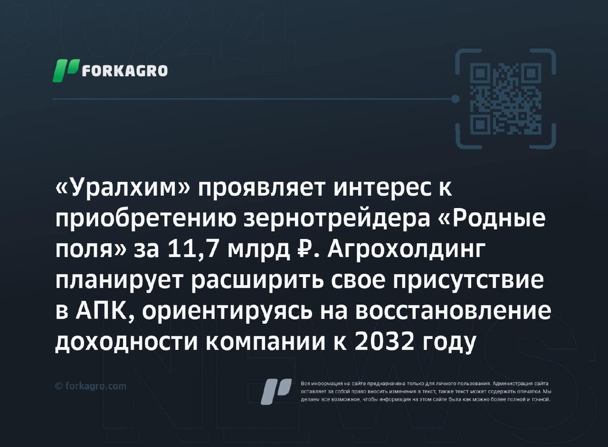 ₽. Агрохолдинг планирует расширить свое присутствие в АПК, ориентируясь на восстановление доходности компании к 2032 году Компания «Уралхим» заинтересована в приобретении всех акций «Родные поля» за 11,7 млрд рублей на аукционе Росимущества. Инвестор получил информацию о лоте, а продажа запланирована на апрель. «Родные поля» попали под управление Россельхозбанка после суда. Предполагается, что к 2030 году компания может достичь 293,4 млрд рублей выручки. Приобретение поможет «Уралхиму» расширить присутствие в сельскохозяйственном секторе. Перейти к источнику