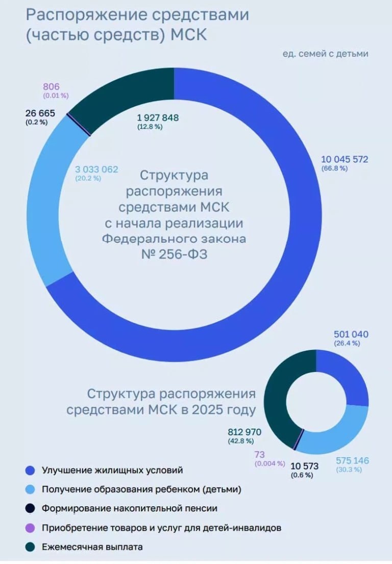 В 2025 году только 26,4% россиян направили средства на улучшение жилищных условий. 🔵За все время действия программы, с 2007 года, было выдано более 15,1 млн сертификатов. На жилье из них использовали 66,8%. 🔵В 2024 году доля таких расходов снизилась до 34,4% против 26,4% в 2025-м. Но при этом растет интерес к использованию маткапитала на образование детей: 🔵28,4% — 2024 год; 🔵30,3% — в 2025 году. Самым популярным способом использования маткапитала теперь стали ежемесячные выплаты — 42,8% за 2025 год.