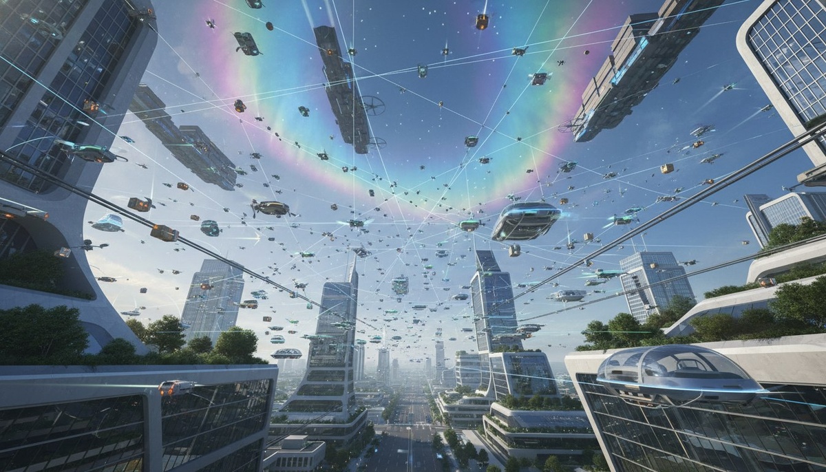 Представьте: вы смотрите в небо, а там — не птицы, не самолеты, не дроны в привычном понимании. Там — миллионы летающих объектов, от крошечных, размером с комара, до гигантских, закрывающих небо. Они доставляют еду, следят за порядком,