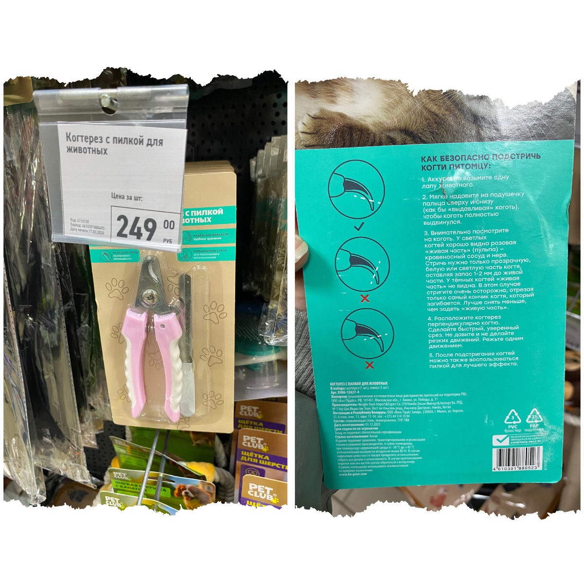 Всем привет. Меня зовут Наталья. Я очень рада видеть вас на своём канале. Сегодня мы с вами прогуляемся по магазину Фикс Прайс, который находится по адресу: город Йошкар-Ола, улица Красноармейская, дом 84а. В этот раз я покажу бомбические новинки для кошечек и собачек. Так что устраивайтесь поудобнее. Желаю всем приятного времяпровождения. Когтерез с пилкой для животных стоимостью 249 рублей. Состав: нержавеющая сталь, полипропилен, ТПР, ПВХ. Страна изготовления Китай. На упаковке есть подробная инструкция, как безопасно подстричь когти питомцу. В магазине 3 варианта. Лапомойка для собак стоимостью 279 рублей. Её размер L. Состав: полипропилен, термопластичная резина. Страна изготовления Китай. Судя по инструкции, пользоваться ей очень просто. Нужно наполнить стакан водой, а при необходимости добавить шампунь. Затем следует поместить лапу в стакан и покрутить лапомойку, чтобы ворсинками помыть лапку со всех сторон от грязи. В конце процедуры вылейте грязную воду и разберите лапомойку д